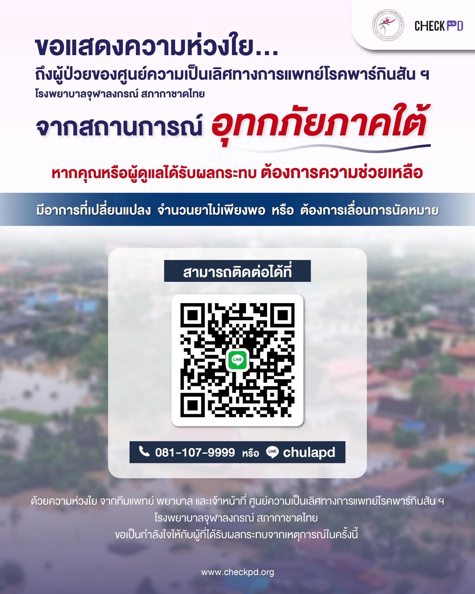 จากวิกฤตการณ์ความรุนแรงของอุทกภัยในหลายพื้นที่ของภาคใต้ขอแสดงความห่วงใย…ถึงผู้ป่วยพาร์กินสันของศูนย์ความเป็นเลิศทางการแพทย์โรคพาร์กินสัน ฯ โรงพยาบาลจุฬาลงกรณ์ สภากาชาดไทยที่ได้รับผลกระทบจากสถานการณ์อุทกภัยภาคใต้หากคุณหรือผู้ดูแลได้รับผลกระทบ หรือต้องการความช่วยเหลือ สามารถติดขอรับความช่วยเหลือได้ที่ :เบอร์โทรศัพท์ : 081-107-9999 หรือ ID Line : chulapdด้วยความห่วงใย จากทีมแพทย์ พยาบาล และเจ้าหน้าที่ ศูนย์ความเป็นเลิศทางการแพทย์โรคพาร์กินสัน ฯ โรงพยาบาลจุฬาลงกรณ์ สภากาชาดไทยขอเป็นกำลังใจให้กับผู้ที่ได้รับผลกระทบจากเหตุการณ์ในครั้งนี้